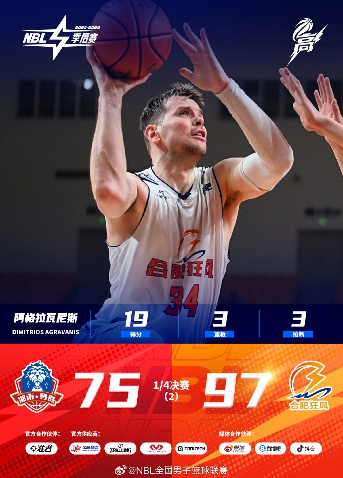 【焦点战战报】NBL季后赛1/4决赛第4场高价值场次:合肥狂风客场大胜长沙勇胜!1/4决赛拖入决胜场。